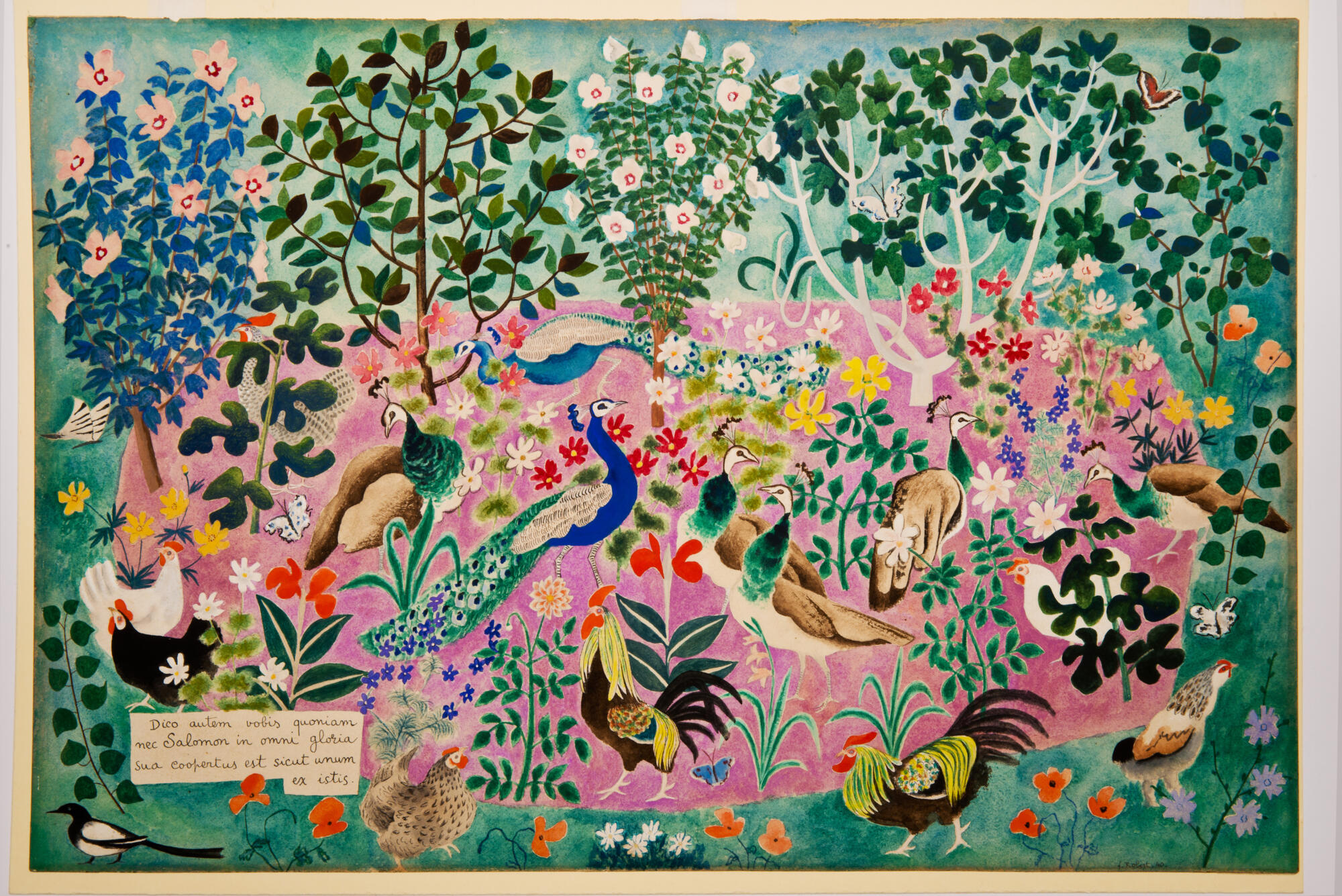 1940 Démobilisé près de Carcassonne (Aude). Émerveillement devant le spectacle d'une cour de ferme dans la profusion de l'été : il transcrit en aquarelle l'univers pictural qui lui est révélé et qu'il ne cessera d'explorer. Ce sera la maquette de sa première tapisserie.